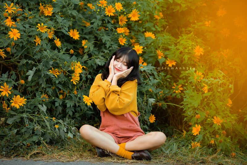 - Lấp ló sau những cánh hoa dã quỳ: kết hợp với biểu cảm tinh tế, dịu dàng, cách tạo dáng này sẽ giúp bạn có được bức ảnh vô cùng xuất sắc, đẹp tự nhiên.